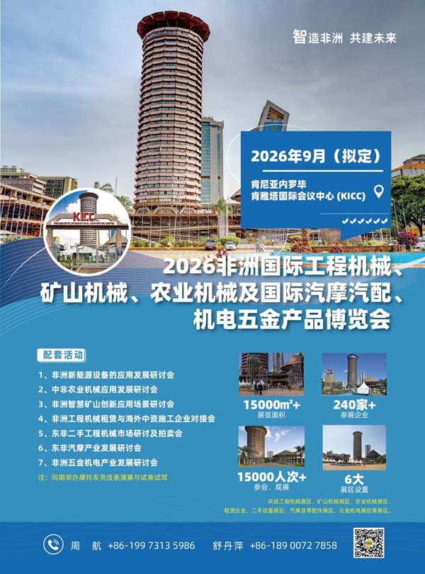 在非洲工业化浪潮与基础设施建设爆发的历史性机遇面前,一场汇聚全球产业力量、聚焦非洲未来发展的国际级行业盛会——“2026非洲国际工程机械、矿山机械、农业机械及国际汽摩汽配、机电五金产品博览会”,拟定于2026年9月在肯尼亚内罗毕肯雅塔国际会议中心(KICC) 隆重举行!