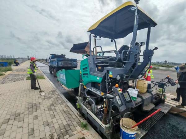 在本次施工项目中,施工方海南宏盛环保建材有限公司使用超级 1380i 在非机动车道进行沥青摊铺作业。在料斗折叠的情况下,超级 1380i 仅 1.85 m 的紧凑机身利用较小的通过宽度和转弯半径,在此类空间受限的工况下显得游刃有余。